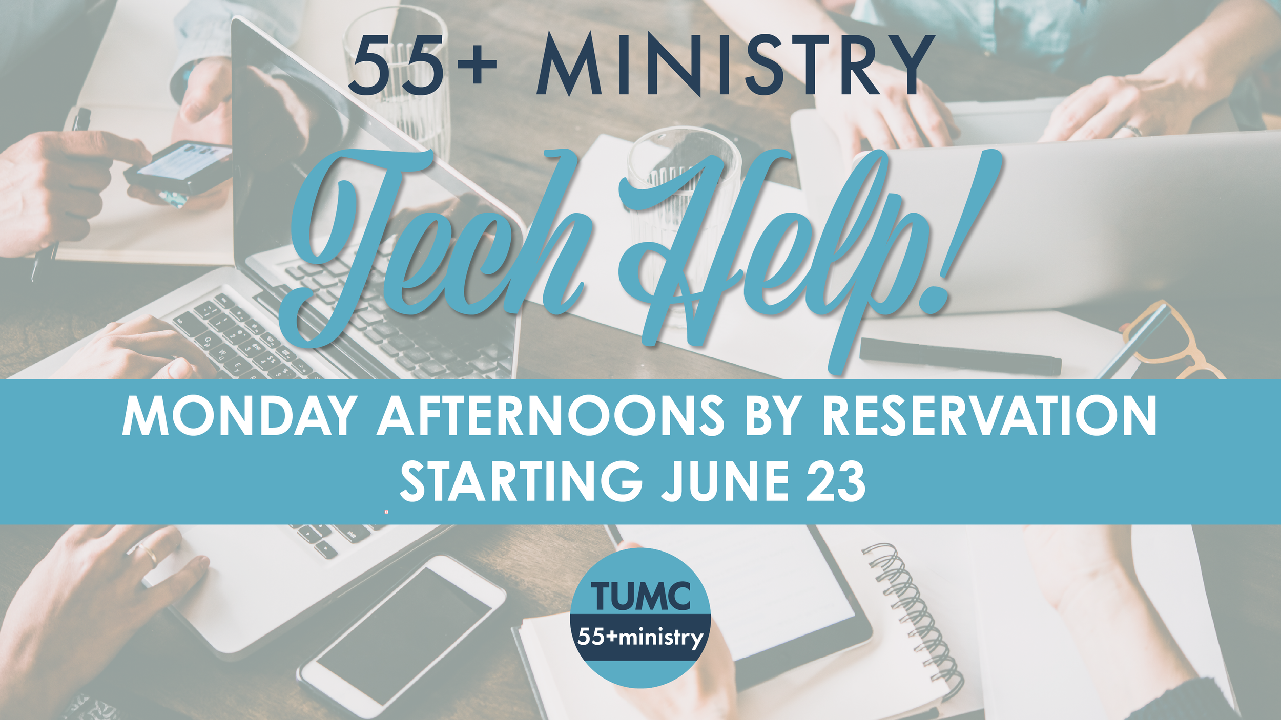 The 55+ Ministry is offering tech help appointments on Monday afternoons from 1:00 to 4:00PM