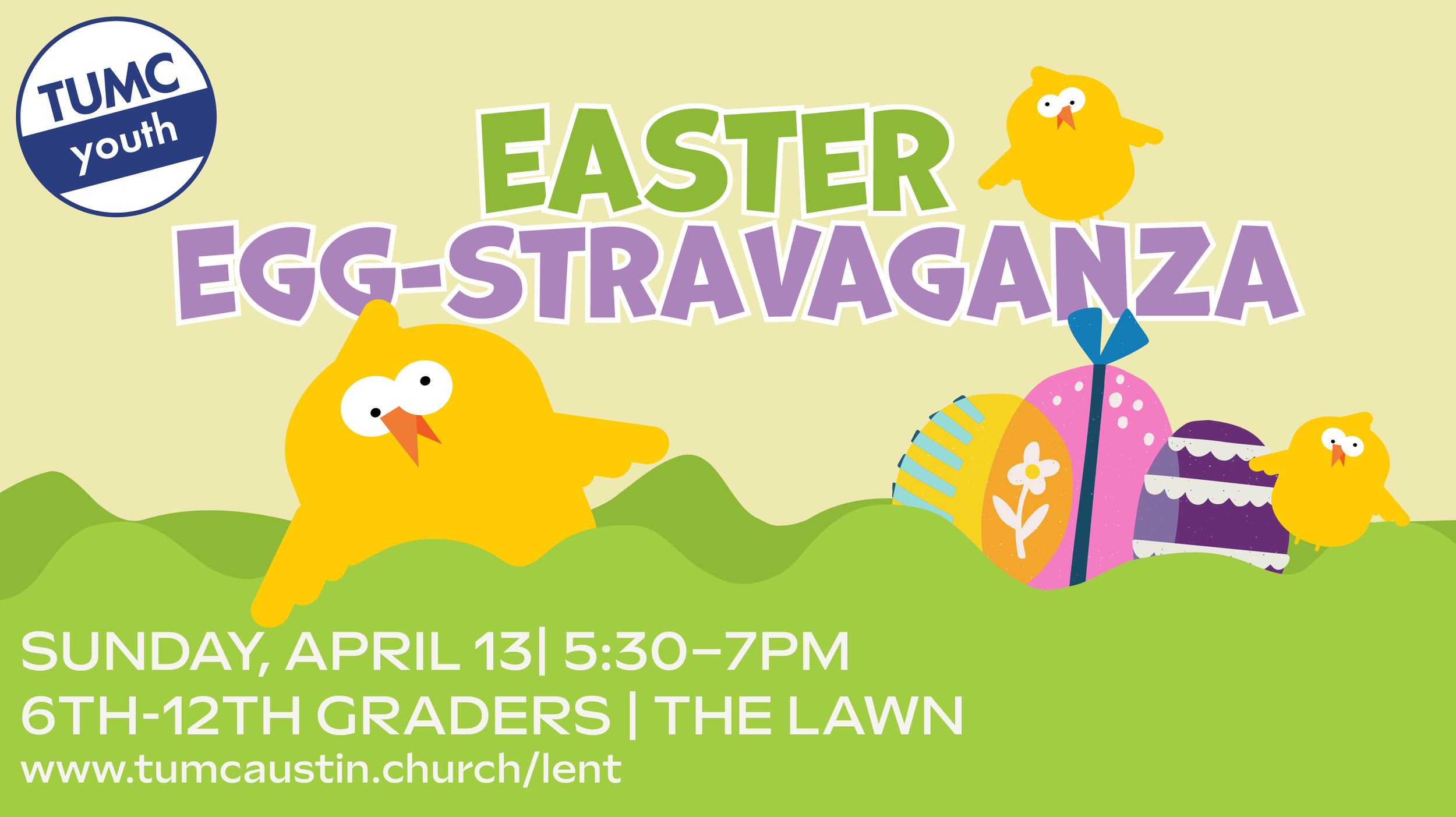 All youth are invited to the Easter Egg-stravaganza, An evening of Egg related fun for all! Egg dying, egg toss, and of course the always popular Egg Roulette. Come celebrate Easter with your friends on the TUMC lawn on March 29, from 5:30–7:00PM! Come for fun and ready to get a little messy.